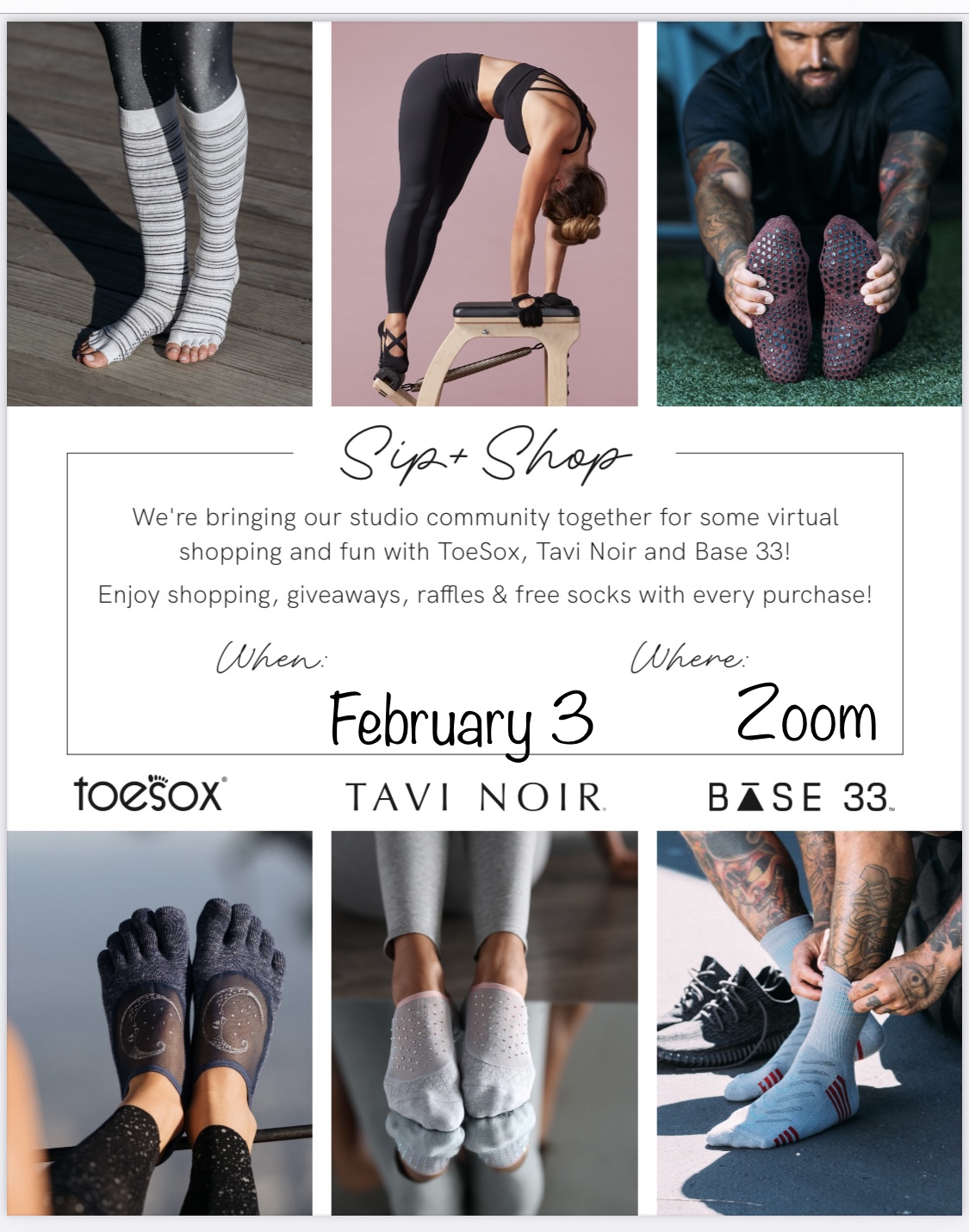 JOIN US VIRTUALLY AFTER THE CHALLENGE AND REWARD YOURSELF WITH A SIP & SHOP EVENT WITH TAVI NOIR, OUR SOCK AND APPAREL VENDOR! POUR YOURSELF A GLASS OF YOUR FAVORITE BEVERAGE AND SEE THE LATEST COLLECTION OF ATHLETIC WEAR AND SOCKS TO BRIGHTEN UP YOUR WARDROBE! YOU'LL ALSO GET TO HANG WITH SOME OF OUR TBC INSTRUCTORS SO STOP BY AND SAY HI! WHEN: FEBRUARY 3RD, 7:30PM-8:30PMWHERE: ZOOM LINK WILL BE EMAILED BEFORE EVENT WHEN YOU REGISTER HEREDOOR PRIZES EVERY 15 MINUTES! NO PURCHASE NECESSARY ***ONCE YOU ADD THE EVENT TO YOUR CART, YOU MUST GO TO THE SCHEDULE TO REGISTER FOR THE CLASS, OTHERWISE THE LINK WON'T BE EMAILED TO YOU!*** |